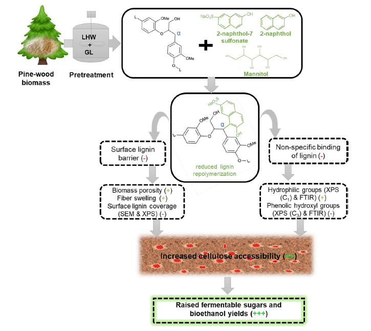 孙付保教授团队在纤维质糖精炼型生物制造方面取得明显进展,相关成果陆续发表在Green Chem (2021, 23: 9600-9609)、Bioresouce Technology (2022, 344: 126264)、Bioresource Technology (2021, 338: 125505)、Industrial Crops & Products (2021, 171: 113975)。近期,研究团队在强化木质纤维素底物水解糖化方面取得重要进展,研究成果“Alleviating lignin repolymerization by carbocation scavenger for effective production of fermentable sugars from combined liquid hot water and green-liquor pretreated softwood biomass”正式发表于Energy Conversion and Management (IF=9.709) (//doi.org/10.1016/j.enconman.2021.114956)