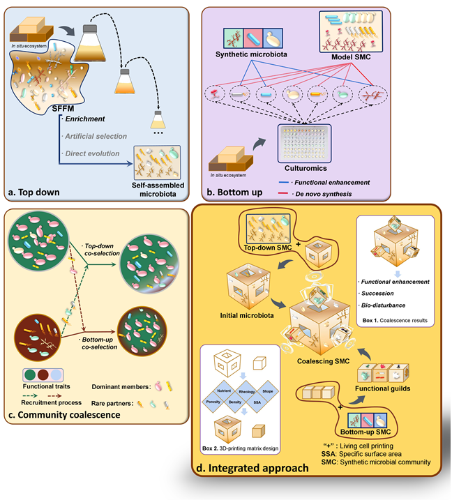 图4.现代NgeME的设计策略 (a)自上而下策略 (b)自下而上策略 (c)群落融合 (d)整合策略