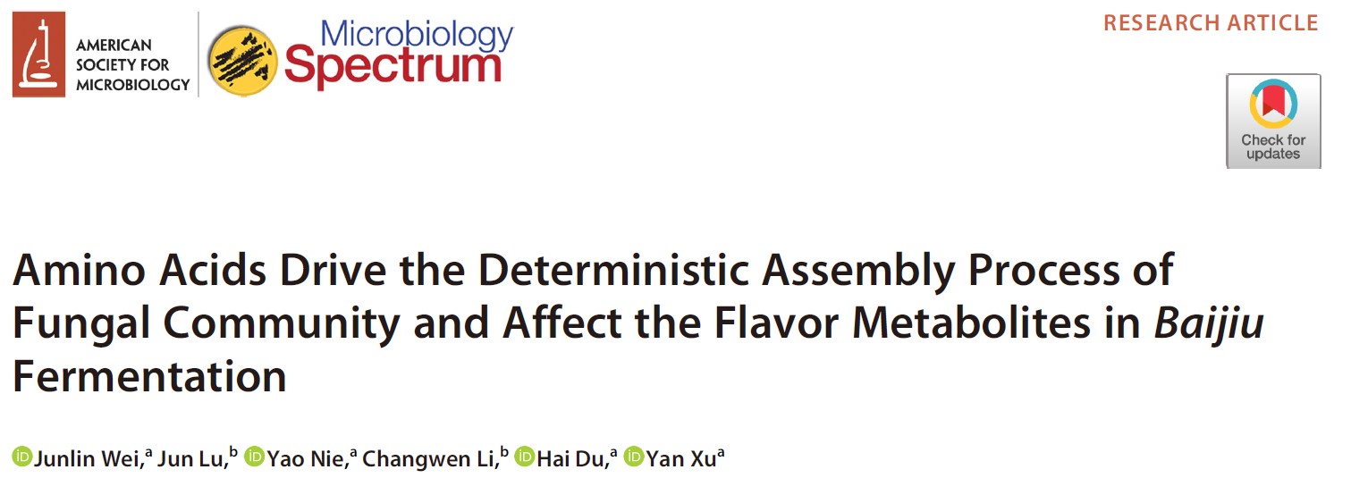 徐岩教授团队在白酒酿造过程中微生物菌群组装机制及代谢方面取得新进展,研究结果“Amino acids drive the deterministic assembly process of fungal community and affect the flavor metabolites inBaijiufermentation”正式发表于Microbiology Spectrum(中科院1区,TOP期刊,IF= 9.043)。