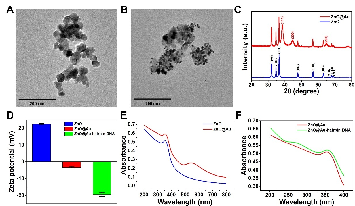 图2 ZnO@Au NPs-hairpin DNA多功能智能纳米器件的表征。(A)ZnO NPs和(B)ZnO@Au NPs的TEM图;(C)ZnO NPs和ZnO@Au NPs的XRD图;(D)ZnO NPs、ZnO@Au NPs和ZnO@Au NPs-hairpin DNA的Zeta电位图;(E)ZnO NPs和ZnO@Au NPs的紫外-可见吸收光谱;(F)ZnO@Au NPs和ZnO@Au NPs-hairpin DNA的紫外-可见吸收光谱