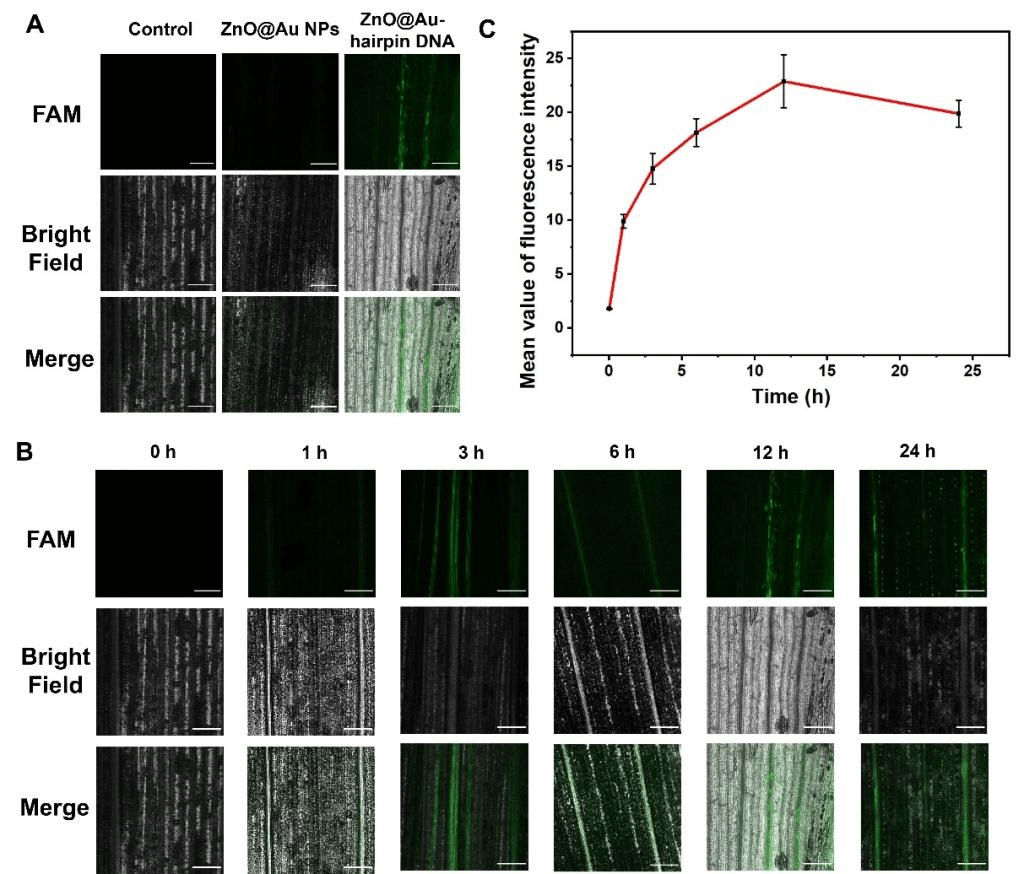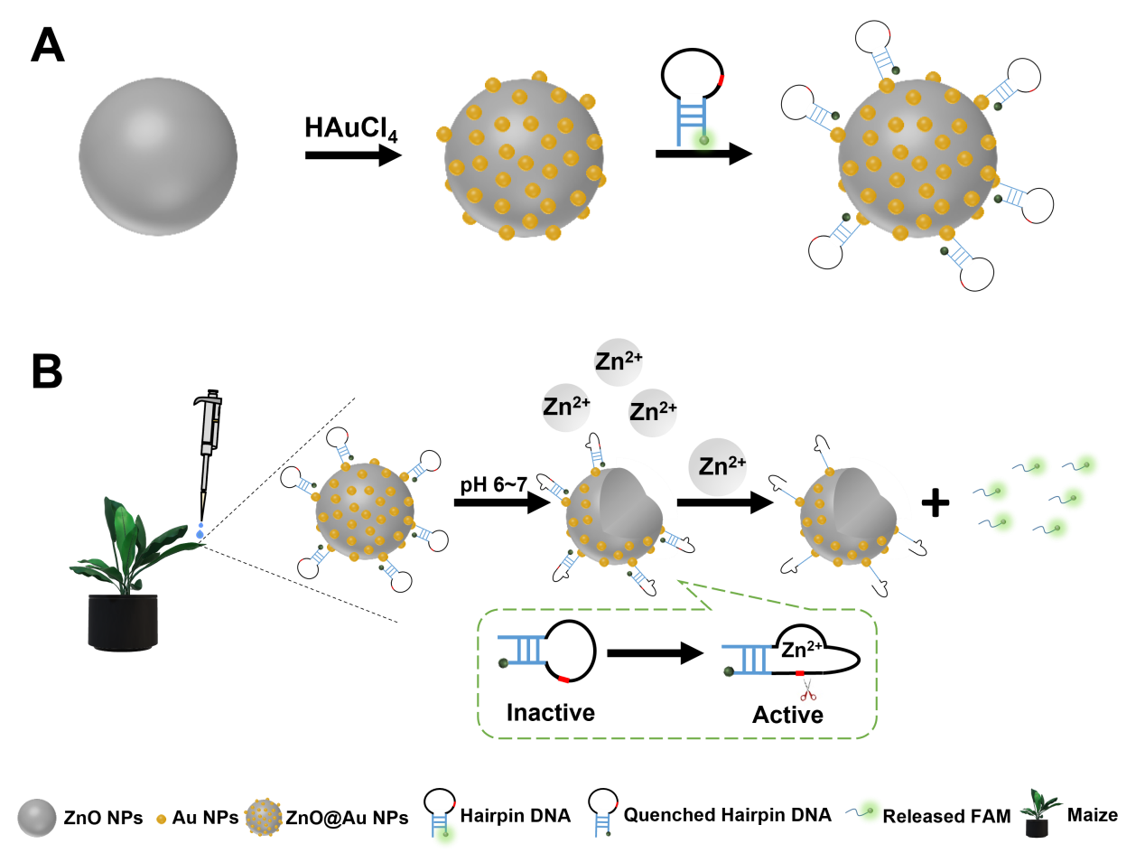作者设计了含有Zn2+依赖型DNAzyme的发夹DNA片段(hairpin DNA),构建出Zn2+荧光生物传感器,并将其修饰在作为纳米肥料的ZnO@Au纳米颗粒(ZnO@Au NPs)上,从而合成出一种用于锌纳米肥料施用后实时监测植物中Zn2+释放和分布的多功能智能纳米器件,为生物体内Zn2+定量分析和迁移转化规律的探究提供了一种新的思路(图1)。