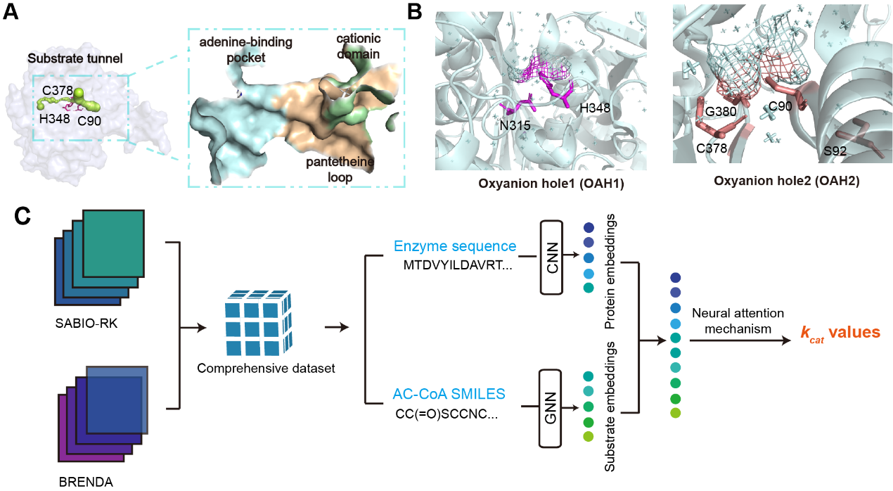 该研究解析了来自褐色喜热裂孢菌的一种耐热的β-酮硫解酶Tfu_0875的晶体结构。该酶具有Cys-His-Cys催化三联体,主要由阳离子结构域、腺嘌呤结合口袋和泛酰巯基乙胺环构成狭窄的底物通道。Tfu_0875的活性结构域含有氧阴离子空穴(OAHs)来稳定底物的过渡态。然后聚焦于底物通道,通过深度学习方法(DLKcat)预测突变体们的kcat来筛选底物通道内酶活提高的突变体。