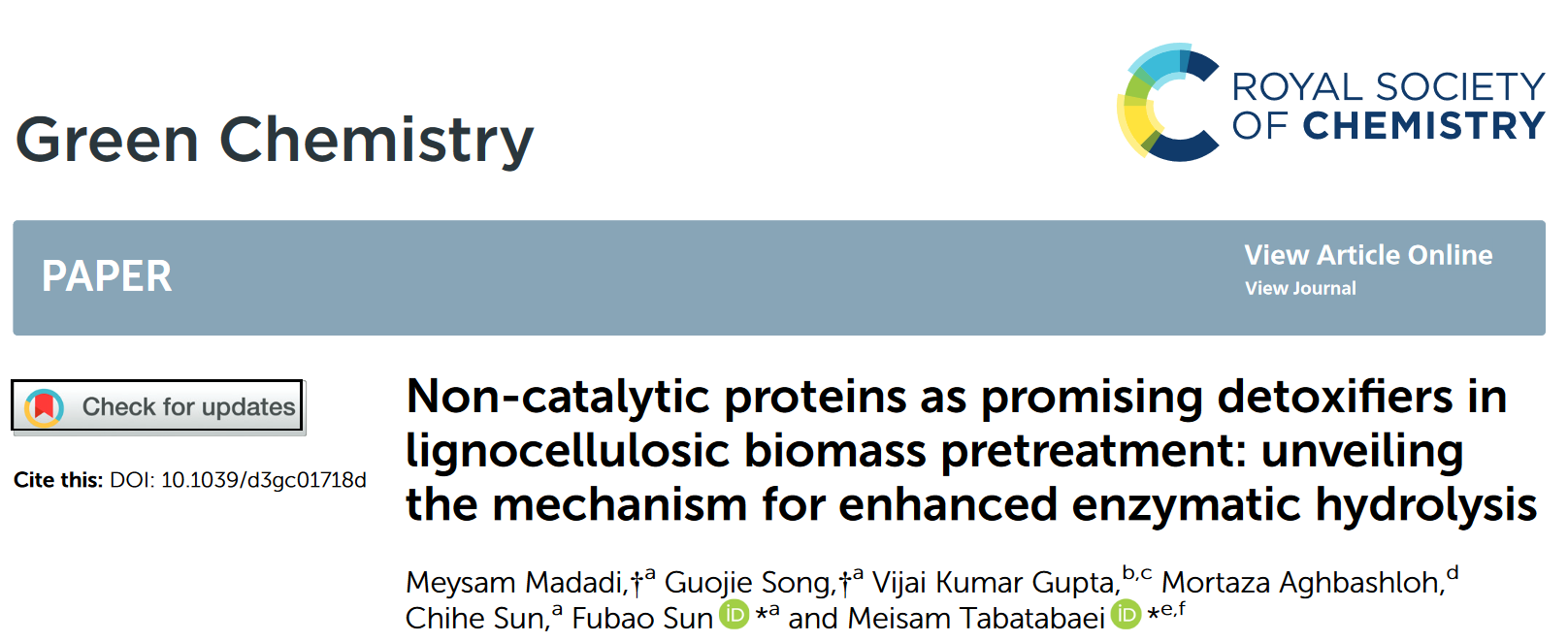 孙付保教授团队在研究先进预处理方法促进纤维质原料水解制糖方面取得重要进展,研究成果“Non-catalytic proteins as promising detoxifiers in lignocellulosic biomass pretreatment: unveiling the mechanism for enhanced enzymatic hydrolysis”正式发表于Green Chemistry (一区, Top, IF=9.8)。