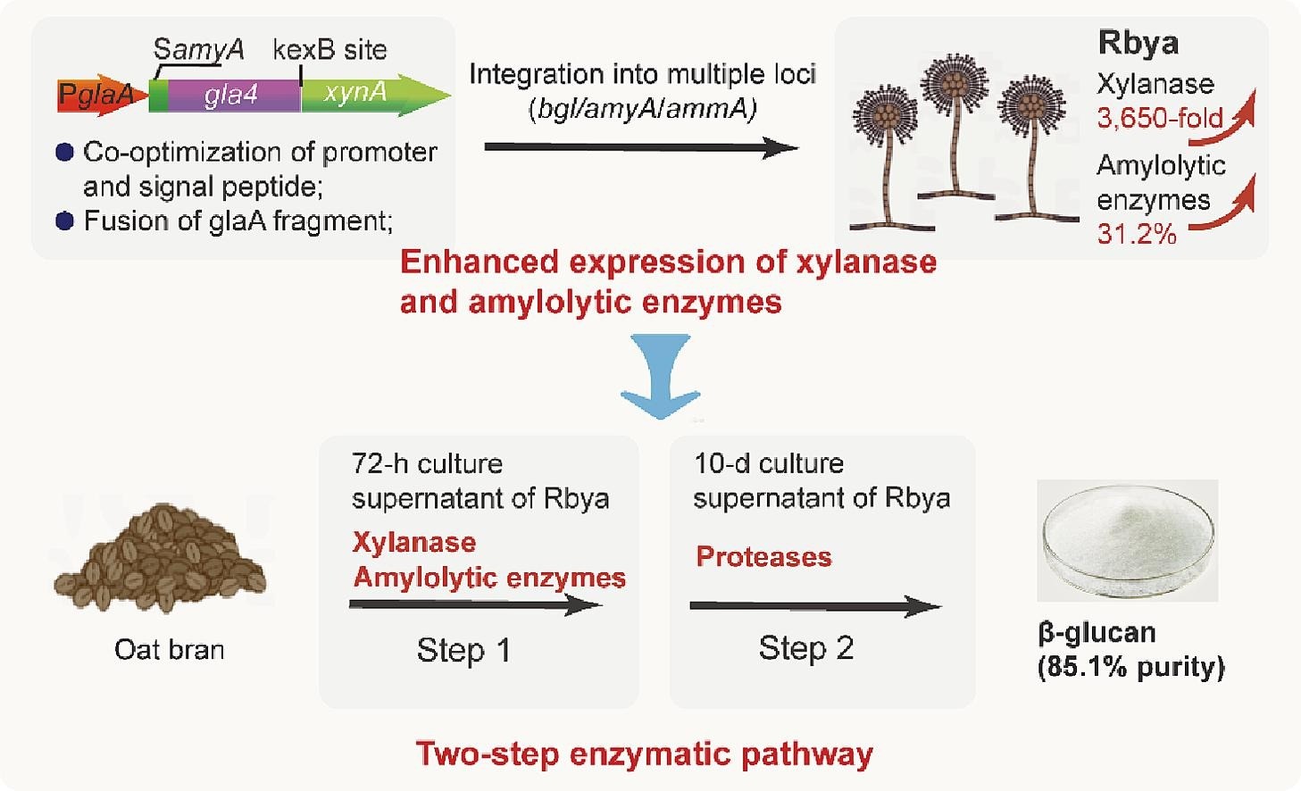 陈坚院士团队刘松研究员课题组在黑曲霉蛋白表达调控及β-葡聚糖制备方面取得重要进展,研究成果“Enhanced expression of xylanase in Aspergillus niger enabling a two-step enzymatic pathway for extracting β-glucan from oat bran” 正式发表于Bioresource Technology(IF=11.889)(//www.sciencedirect.com/science/article/pii/S0960852423003887?via%3Dihub#f0035)。