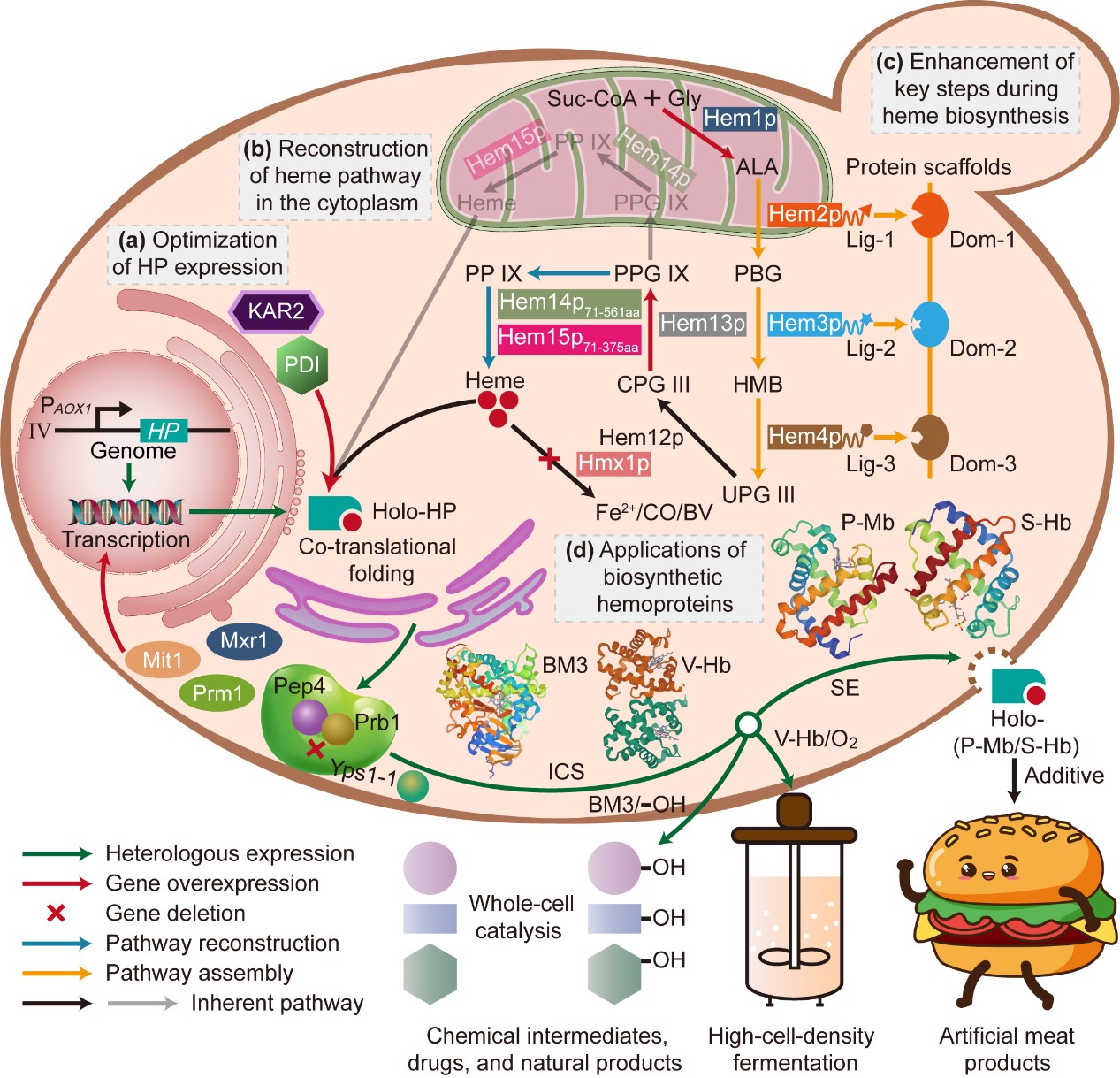 食品合成生物学与生物制造团队研究人员通过增强P. pastoris底盘细胞中血红素的供给水平,实现了高活性血红素结合蛋白的高效合成。首先,通过考察不同P. pastoris宿主、基因拷贝数、发酵时间等条件对血红素结合蛋白中珠蛋白组分表达的影响,选择了合适的基于甲醇诱导的表达系统(PAOX1),并通过过表达PAOX1转录激活因子(Mit1、Mxr1与Prm1)、敲除蛋白酶(Yps1-1、Prb1与Pep4),强化了珠蛋白的转录和翻译水平并抑制其降解。最终在珠蛋白表达水平强化菌株P1中,P-Mb、S-Hb、V-Hb与P450-BM3的产量分别达到了162.46 ± 11.12 mg L-1、184.35 ± 17.14 mg L−1、32.32 ± 5.94 mg L−1与28.31 ± 5.44 mg L−1。