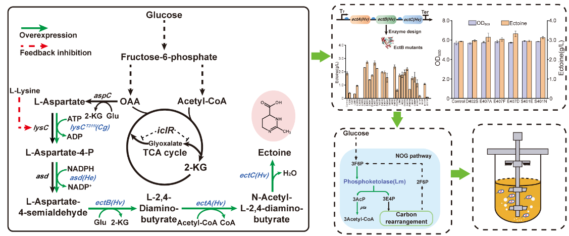 研究团队针对四氢嘧啶制备过程中葡萄糖转化率低和限速酶——二氨基丁酸-2-酮戊二酸转氨酶活性不够高的问题,采用代谢工程和酶工程结合的策略高效合成四氢嘧啶。由于大肠杆菌中缺少四氢嘧啶直接合成途径,研究人员将4种异源的四氢嘧啶合成途径引入大肠杆菌中,筛选出最适的出发菌株。比较发现在E. coli BL21(DE3)中表达来源维式盐单胞菌(Halomonas venusta ZH )的合成途径效果最佳,通过表达载体优化后,在摇瓶水平发酵可积累2.1 g/L的四氢嘧啶。然后通过过表达来源谷氨酸棒杆菌的天冬氨酸激酶突变体(LysCT311I)与来源伸长盐单胞菌的天冬氨酸半醛脱氢酶(ASD)增加了前体供应。为进一步提高限速酶的活性,对EctB进行半理性设计,突变体(E407D)在摇瓶水平中可积累3.3 g/L四氢嘧啶,相比对照菌株提高了13.8%。分析不同EctB有效突变体和野生型与底物分子的对接模拟,发现所有点突变都位于蛋白质表面而非活性位点,这些突变可能通过表面电荷的变化增加了结构的灵活性。通过引入非氧化糖酵解途径(NOG途径)提高乙酰辅酶A的供应,四氢嘧啶产量进一步提升至4.1 g/L。最终,在5 L发酵罐中对工程菌株ECT9-5进行分批补料发酵,发酵过程控制底物葡萄糖浓度在1 g/L以内,发酵60 h后四氢嘧啶产量达到67.1 g/L,葡萄糖转化率为0.3 g/g。本研究通过半理性设计改造关键酶EctB提高了四氢嘧啶的生产能力,为工业化生产奠定了基础。另外,所采用的策略也可为高效生产其他天冬氨酸衍生物提供参考。