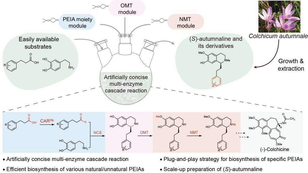 植物来源的生物碱是一类重要的药物。然而,其获取方式仍然依赖于植物提取,难以满足当前市场需求。多酶级联反应作为一种高效的生产方式,正在革新天然产物的生物制造。因此,为了解决微生物合成生物碱的难题,饶义剑教授团队借助于酶挖掘和酶工程手段构建了一个能够利用简单易得的底物合成天然的和非天然的苯乙基异喹啉生物碱(Phenethylisoquinoline alkaloids, PEIAs)的人工简短酶级联反应系统。更重要的是,通过“即插即用”策略替换该系统中的限速酶,实现了秋水仙碱前体(S)-autumnaline的高效合成与放大制备。这项研究不仅简化了未来秋水仙碱生物合成的步骤,还为通过多酶级联反应合成其他生物碱提供了范例。