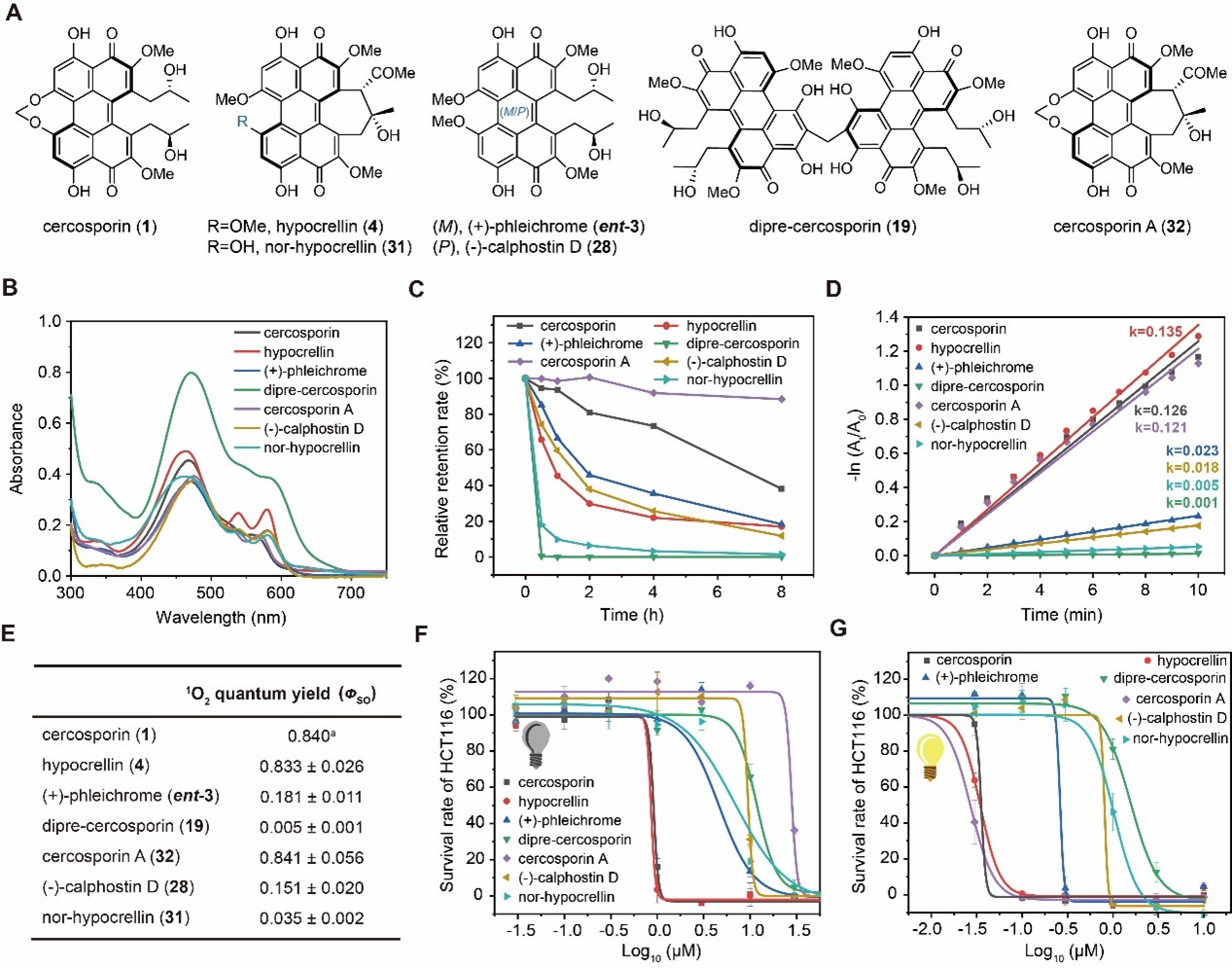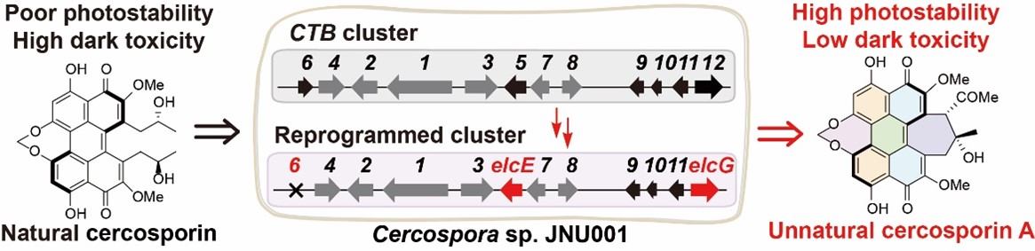 饶义剑团队基于B类苝醌化合物的分支代谢途径,采用合成生物学策略对尾孢菌素的生物合成途径进行重编程,实现了一系列具有不同构型和取代基苝醌衍生物的生物合成。其中,非天然苝醌化合物尾孢菌甲素(cercosporin A)不仅具有较高的光稳定性和极低的暗毒性,并且保留了良好的光动力抑菌和抗癌活性。此外,研究发现尾孢菌甲素可以选择性地在细胞中富集,为苝醌化合物的药物开发提供了潜在的靶点,并拓宽了从自然界中发现药物的渠道。
