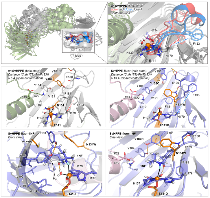 首先,作者以N-氟酰胺底物1NF作为模型底物,在全细胞条件下测试了40多种不同的非血红素铁酶,其中包括了前期开发叠氮化反应所积累SavHppD突变体库。通过测试发现了几种能够催化不对称氟转移反应的酶,最好的结果来自绿色链霉菌(Streptomyces viridochromogenes)的(S)-2-羟基丙磷酸酯环氧化酶(SvHppE),它以总转化数TTN = 5、产率3.8%以及e.r = 74:26的对映体比例生成了目标氟化产物。在不含SvHppE的空白对照实验中,仅能观察到痕量的氟化产物。此外,与催化中心铁配位的两个组氨酸被突变为丙氨酸,反应的产率和对映选择性显著降低,上述结果表明该转化过程是由金属铁中心催化完成。