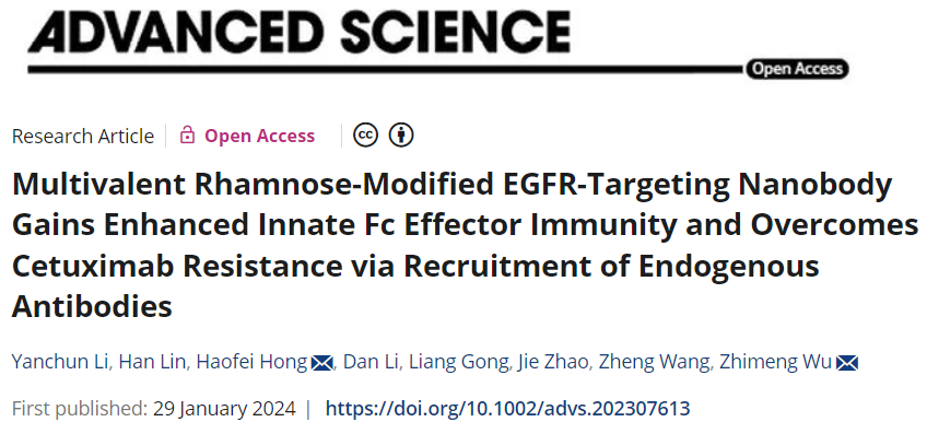 吴志猛教授团队在抗体偶联药物方面取得重要进展,研究成果“Multivalent Rhamnose-Modified EGFR-Targeting Nanobody Gains Enhanced Innate Fc Effector Immunity and Overcomes Cetuximab Resistance via Recruitment of Endogenous Antibodies”正式发表于Advanced Science (IF=15.1) (//onlinelibrary.wiley.com/doi/10.1002/advs.202307613 )。
