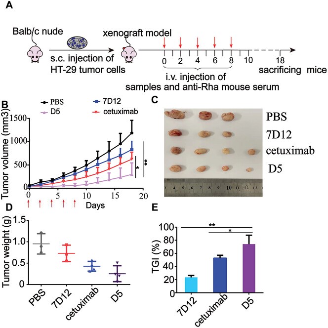 最后,西妥珠单抗耐药的HT-29肿瘤异种移植小鼠模型实验(图3)显示,7D12-十六价Rha偶联物D5对肿瘤的生长抑制效果最为明显,其肿瘤抑制率(TGI:74.1%)明显优于西妥昔单抗(TGI:52.7%)、以及未修饰的7D12(TGI:23.4%)