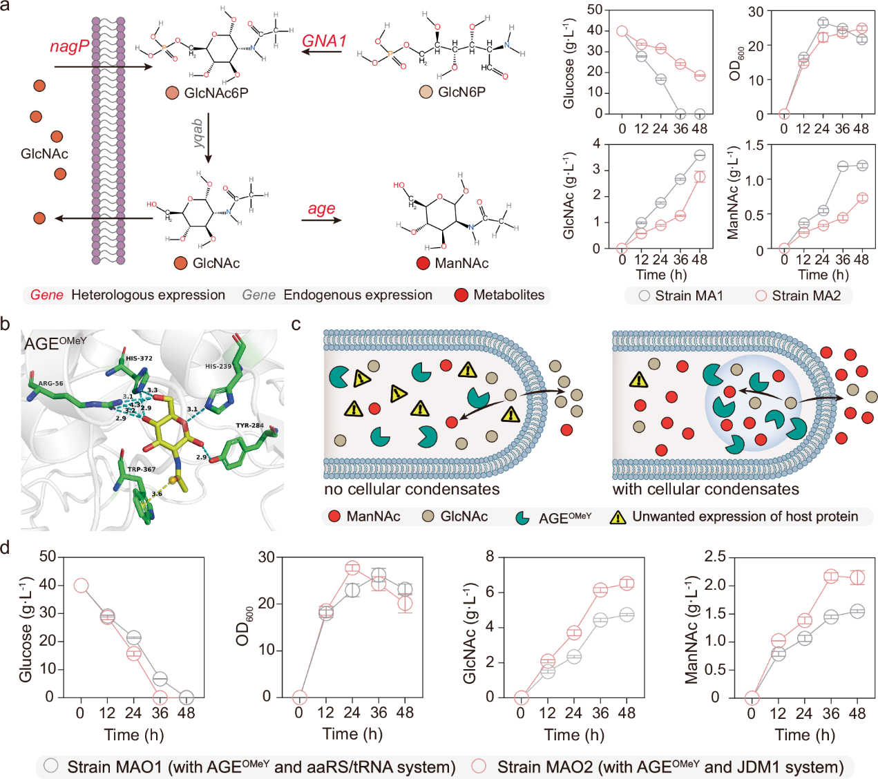 为了进一步验证B. subtilis中人工无膜细胞器的应用可行性,以2’-岩藻糖基乳糖(2’-FL)代谢网络为例,利用人工无膜细胞器招募2’-FL合成途径中的五种关键催化酶,2’-FL产量较对照组提高了123.3%(图5)。此外,结合遗传密码扩展技术,对N-乙酰甘露糖胺(ManNAc)合成途径中的关键催化酶N-乙酰-D-葡萄糖胺-2-差向异构酶(AGE)进行了理性设计与改造,其突变体AGEOMeY催化活性较野生型提高了86.0%。之后,利用前期构建的空间分离的正交翻译系统,有效降低了胞内非目的基因的错误翻译表达,实现了AGEOMeY的高选择性翻译,ManNAc产量较对照组提高了75.0%(图6)。