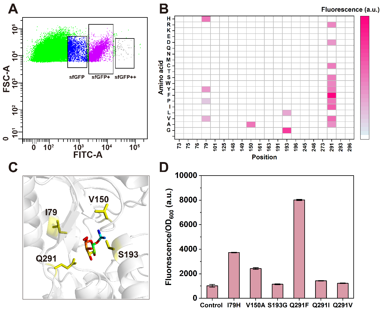 在此基础上,为实现乳糖合成模块与2¢-FL合成模块的动态调控,该研究结合致死基因回路和荧光信号基因回路的设计,搭建了一种高通量的乳糖响应型生物传感器筛选平台(图4),成功获取多种可以响应乳糖信号的生物传感器(图5);基于该乳糖生物传感器构建了乳糖响应遗传回路,用于动态调节乳糖和2¢-FL生物合成模块之间的代谢通量;最终,工程菌株在摇瓶中的2¢-FL产量提高至9.67 g/L,在3-L发酵罐中以葡萄糖为唯一碳源的产量和转化率分别达到30.1 g/L和0.15 g/g(图6)。相关研究成果为构建高效合成2¢-FL的细胞工厂提供了重要参考。