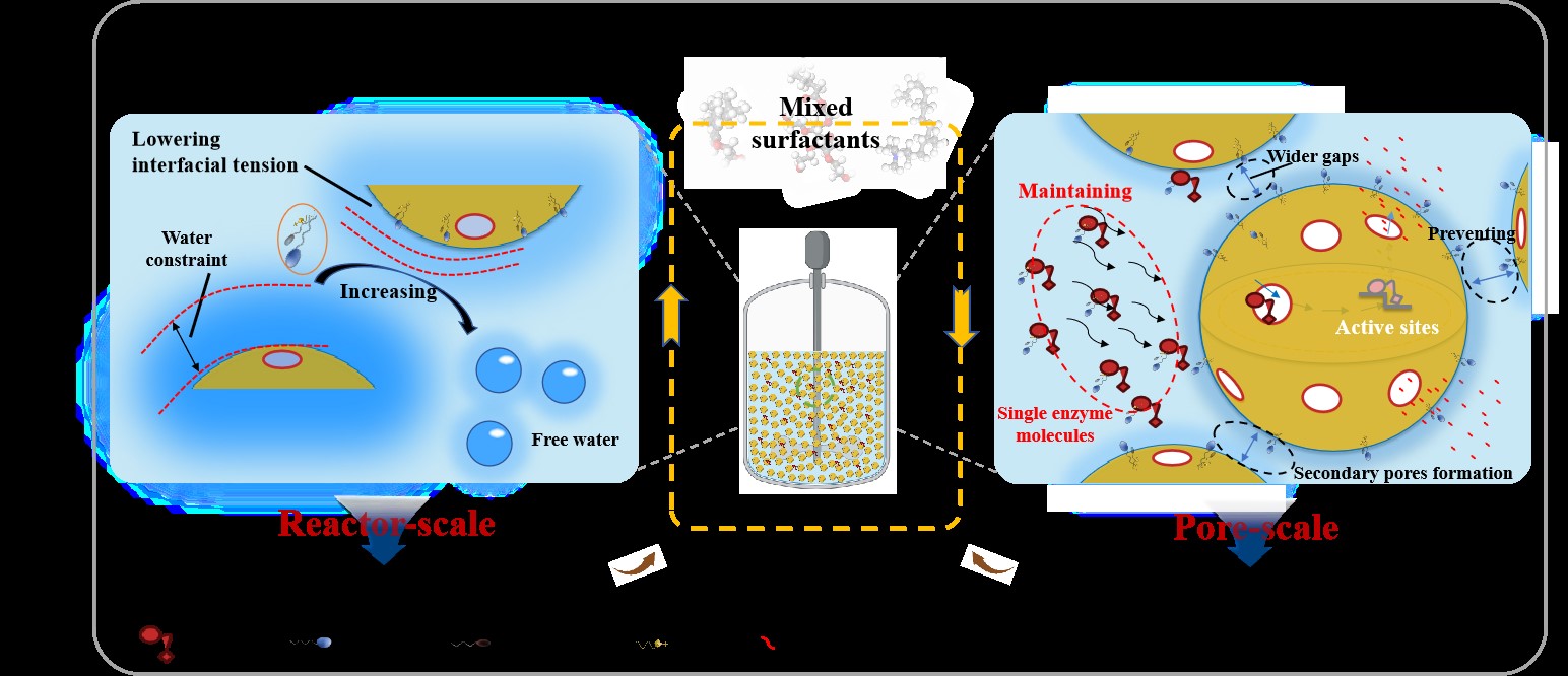 本论文聚焦于分析混合表面活性剂缓解浓底物醪酶水解过程传质受阻的作用机制。结果表明,混合表面活性剂在反应器尺度上能显著降低浓醪底物酶解的浆料粘度,从而有效促进了纤维素酶在早期酶水解阶段向颗粒表面的对流扩散;在孔隙尺度上,混合表面活性剂在传质过程中能够维持纤维素酶的单分子形态(< 8.9 nm),从而降低了颗粒原生孔隙中的空间位阻效应,此外也能有效促进水相体系中底物的均匀分散并抑制聚集颗粒间次生孔隙的形成,这些协同作用显著增强了孔隙尺度上的酶传输效率;在糖产物扩散传递方面,混合表面活性剂能够有效缓解它扩散转移时的高底物浓度抑制,而且也能降低它反馈抑制导致酶失活的风险。总之,论文研究结果为重视混合表面活性剂应用于纤维质底物浓醪酶水解糖化过程提供理论依据。
