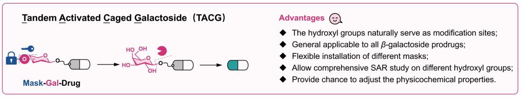 尹健教授团队旨在利用β-gal的高底物特异性解决β-gal肿瘤细胞分布特异性不足的问题。团队以半乳糖的羟基为修饰位点,在羟基上引入遮蔽基团,构建了全新的半乳糖苷双前药。该类双前药需首先响应遮蔽基团对应的刺激条件后裸露出半乳糖的羟基,然后才能进一步响应β-gal释放母药,被称为Tandem Activated Caged Galactoside(TACG),通过“与”门逻辑关系提升了药物释放的可控性(图2)。
