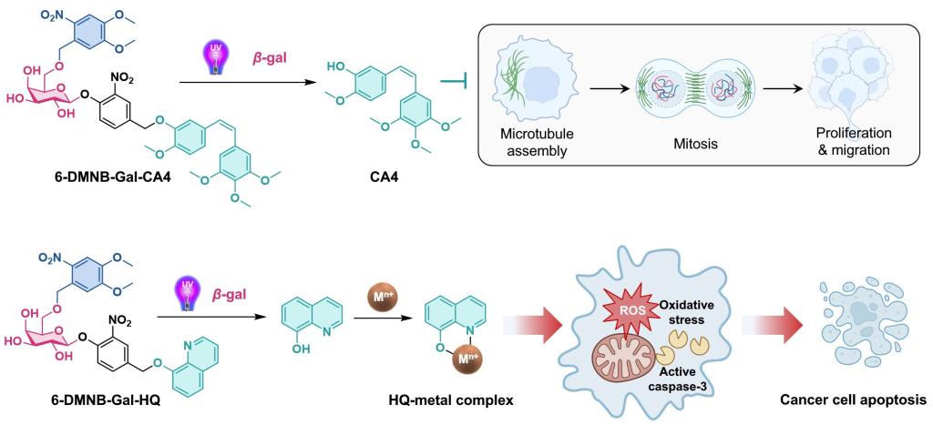 光照激活由于其优异的时空可控性在前药领域有着广泛应用。作者接下来选择用光笼基团DMNB修饰半乳糖6位羟基,选择微管蛋白聚集抑制剂combretastatin A4(CA4)和金属离子螯合剂羟基喹啉(HQ)为药物分子,构建了双前药6-DMNB-Gal-CA4和6-DMNB-Gal-HQ。生物活性评价证实,双前药依次响应紫外光照(UV)和β-gal后释放出对应的母药并发挥抗肿瘤活性(图3)。
