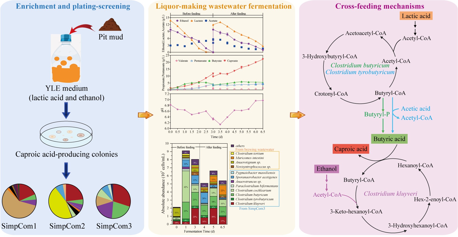近日,徐岩教授团队任聪副研究员在利用厌氧发酵技术处理酿酒废水制备己酸方面取得重要进展,研究结果“Constructing simplified microbial consortia that couple lactic acid and ethanol utilization to highly produce caproic acid from liquor-making wastewater”正式发表于Water Research (自然指数杂志,IF=12.4) (//doi.org/10.1016/j.watres.2025.123973)。该团队创新采用 “Top-down” 厌氧微生物群落构建策略,从浓香型白酒窖泥中筛选出高效产己酸的简化微生物群落,成功将酿酒废水中的可降解碳转化为高价值中链脂肪酸 —— 己酸,为酿酒废水资源化利用与低碳生物炼制提供了重要解决方案。