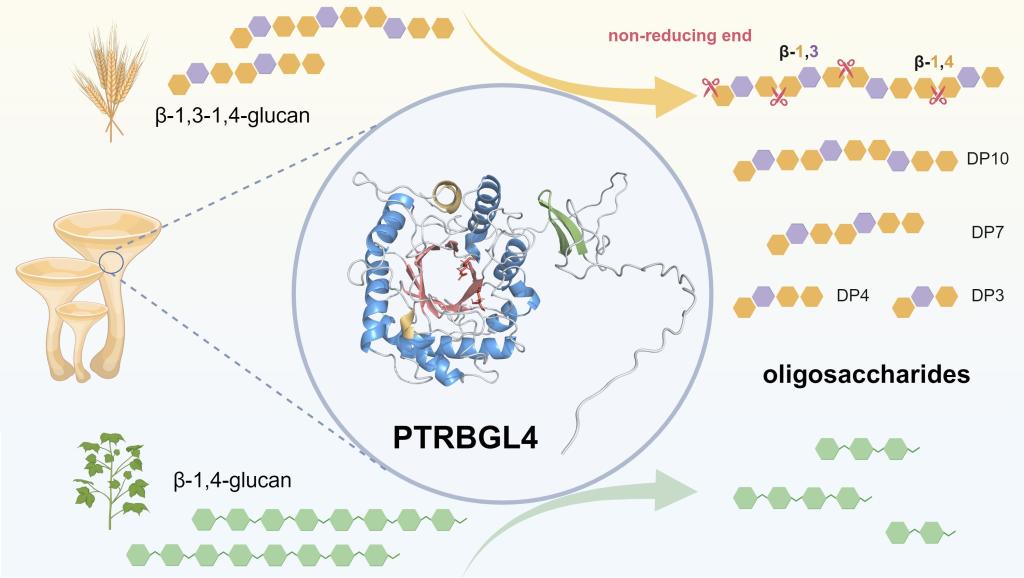 混合连接β-葡聚糖(Mixed-linked β-glucan, MLG)是广泛存在于燕麦、大麦等谷物中的一类重要膳食多糖,因其独特的分子结构而具有调节血糖、增强免疫及益生元等多种生物活性,MLG的降解产物也被证明具有多种生物活性。然而,传统酶解方法通常专一性不强,产生的寡糖产物结构不均一,限制了其在功能性食品和生物医药领域的高值化开发和应用。基于此,本研究首次从高等真菌虎奶菇(Pleurotus tuber-regium)基因组中挖掘出一种新型的β-1,4-葡聚糖酶(命名为PTRBGL4),并成功在毕赤酵母中实现异源表达。研究发现,该酶对仅含β-1,4-糖苷键的底物(如羧甲基纤维素钠)活性较低,但对含有β-1,3和β-1,4混合连接的燕麦及大麦β-葡聚糖表现出极高的催化活性和特异性。