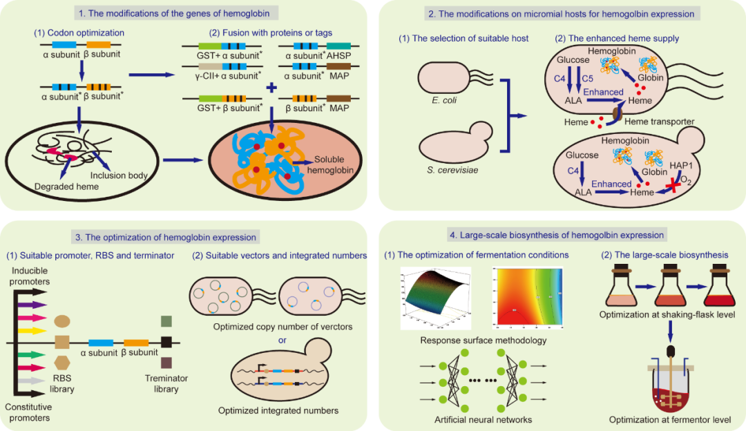 图3 用于增强微生物合成血红蛋白的策略