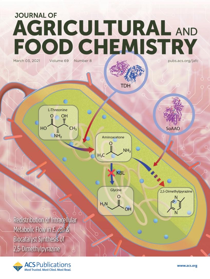 工业生物技术教育部重点实验室饶志明教授团队在系统生物学改造工业微生物高效合成2,5-二甲基吡嗪研究方面取得新进展。研究成果“Redistribution of Intracellular Metabolic Flow in E. coli Improves Carbon Atom Economy for High-Yield 2,5-Dimethylpyrazine Production”在线发表于美国化学学会(ACS)《Journal of Agricultural and Food Chemistry》(Top期刊、SCI一区期刊,IF: 4.192 )(J. Agric. Food Chem. 2021, 69, 8, 2576–2584)并被评选为封面论文(Front Cover)。