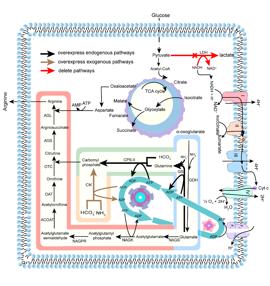 图1钝齿棒杆菌中L-精氨酸合成途径及本研究促进生产L-精氨酸的代谢工程策略