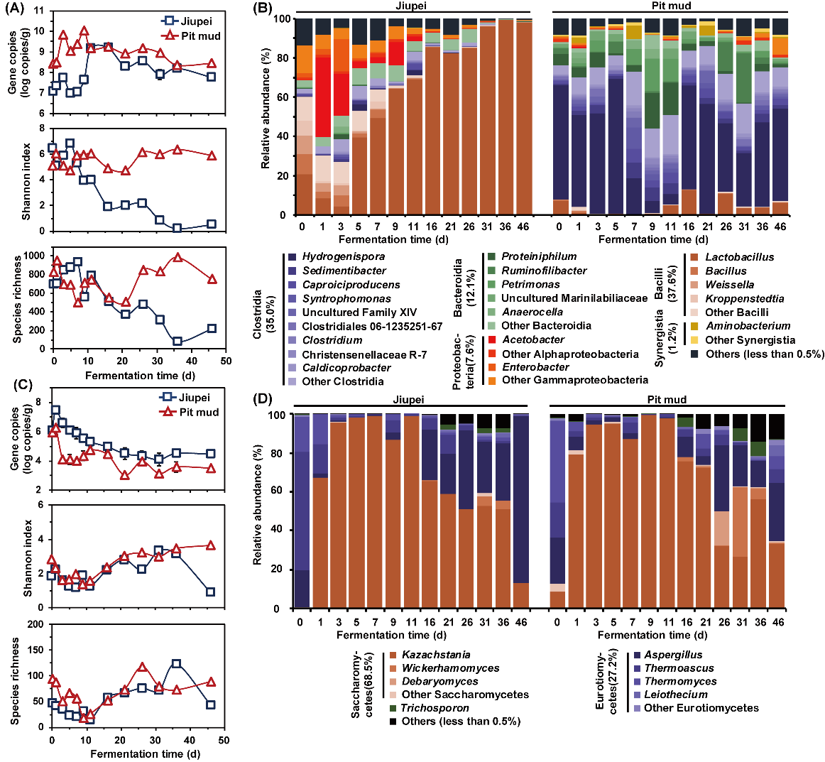 许正宏教授团队分析了在浓香型白酒酿造过程酒醅和窖泥微生物群落的结构和代谢产物变化规律,通过与环境因子相关性分析、微生物交互网络分析、PICRUSt功能预测和发酵验证实验,发现浓香型白酒泥窖中存在两个环境特征显著差异的发酵模块,一是以乳酸杆菌属(Lactobacillus)为优势菌主要代谢产乳酸和乙酸的酒醅发酵体系,另一个是以梭菌(包括Hydrogenispora、Caproiciproducens和Clostridium等)为优势菌主要代谢产己酸和丁酸的窖泥发酵体系,两者之间可以通过黄水进行代谢产物的传递,酒醅菌群产生的乳酸和乙酸为窖泥菌群提供了底物,后者产生的己酸和丁酸通过黄水带入酒醅,与乙醇酯化为浓香型白酒的典型香气物质己酸乙酯和丁酸乙酯。以上研究为理解浓香型白酒泥窖生香发酵的独特工艺提供了理论依据。