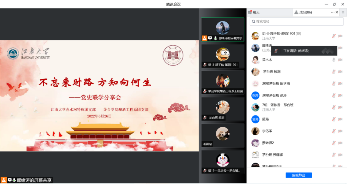 酿酒1901班“赤水河”特称团支部联合茅台学院酿酒工程系学生,开展“不忘来时路,方知向何生”党史联学分享会,7名同学“云端”进行学习分享,两校近百名酿酒学子线上参与活动。