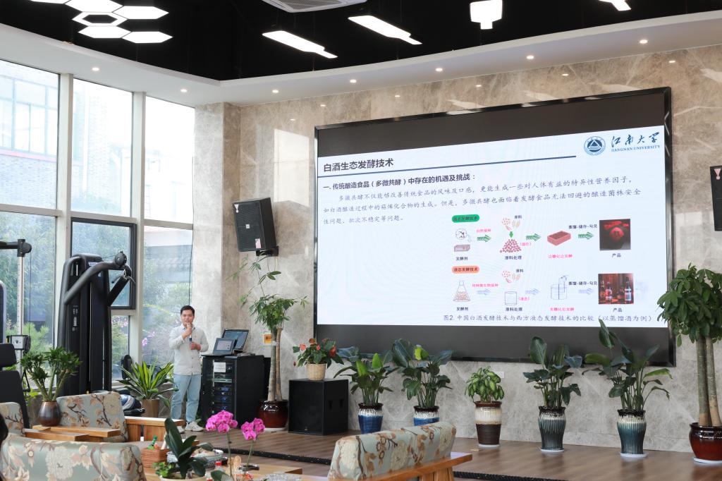 在玉祁运动力馆,博士生杜如冰向企业同仁讲解了《白酒酿造过程微生物及产物分析》,从酿造的历史起源到微生物产物代谢结尾,他从专业角度上向大家分享了酿造与酒文化的魅力。为进一步深化党史学习教育、致敬建党百年,学院党史宣讲团成员、生物1901班本科生潘子翯以国庆热片《长津湖》为引子,向大家介绍了人民志愿军舍生忘死、不畏艰险打赢抗美援朝战争的艰辛历程,深入阐释了抗美援朝精神的现实意义。
