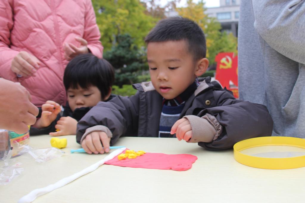 升旗仪式之后,张若清小朋友满怀深情地演唱了《歌唱祖国》,悠扬的歌声流露出对祖国深深的热爱。紧接着家长和小朋友们共同参加“国旗在我心中”手工制作活动,首先家长引导小朋友认真观察国旗,然后一起动手用彩色的橡皮泥捏出国旗的样子,并发挥想象力配上太阳、蓝天、白云、草地,形成一幅幅生动的图画,鲜艳的五星红旗和孩子们可爱的笑脸交相辉映。