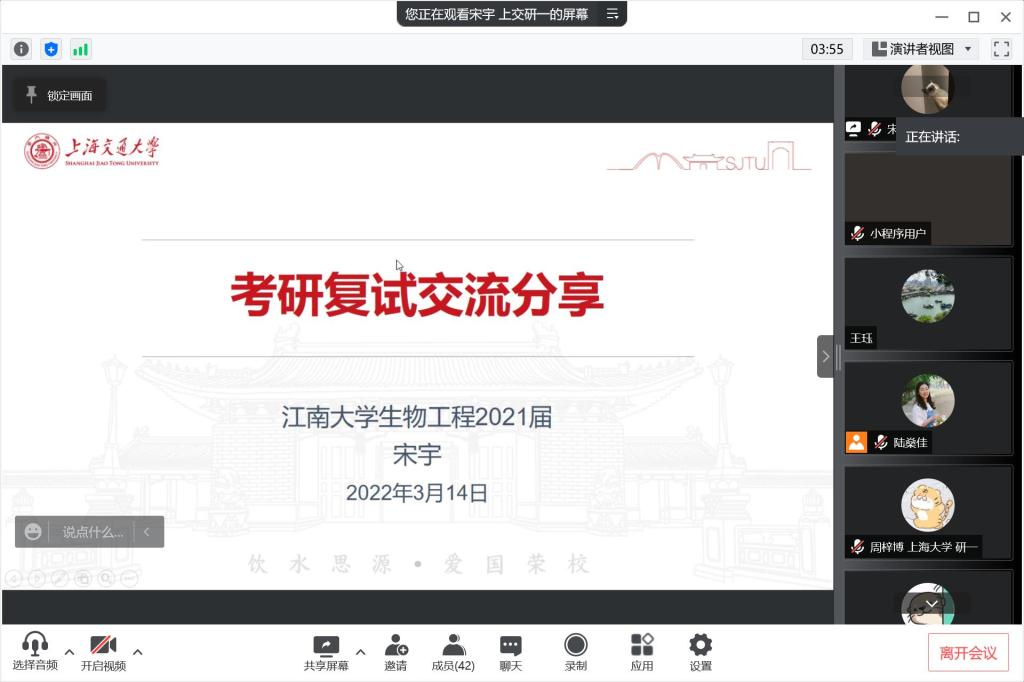 分享会前,学院汇总了2022届毕业生考研升学的详细数据,提前了解了同学的复试需求和困惑。3位主讲同学精心准备了PPT,他们结合自身考研经历,分别从复试信息的搜集、复试内容的准备、复试考察的重点、调剂信息查询、调剂系统操作等方面与同学们交流,以自己的经验鼓励同学们沉着冷静,积极备战复试和调剂。