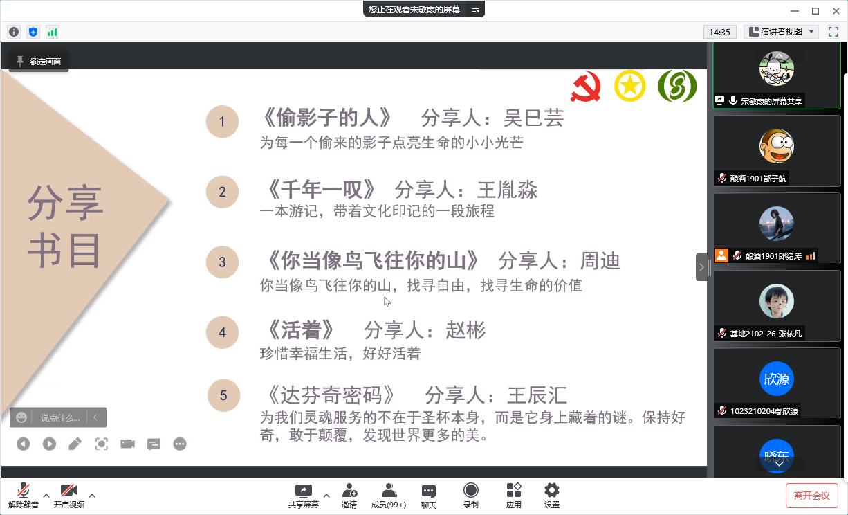 本科生第二党支部、酿酒1901班“赤水河”特称团支部联合举办了“书海遨游拾贝”读书分享会。来自党支部和团支部的5名同学依次分享了推荐书籍,100余名同学聆听分享。在思想碰撞中,大家的视野得以打开,收获颇丰。