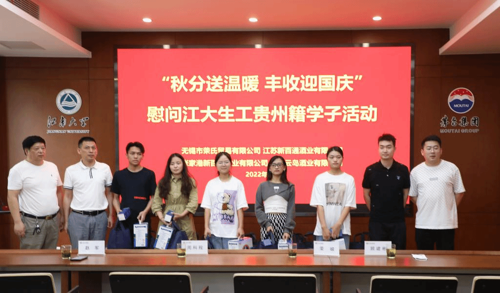 9月23日,时值二十四节气中的“秋分”,无锡市荣氏贸易有限公司传承人荣嵘、江苏新百通酒业有限公司总经理赵军、无锡云岛酒业有限公司传承人周科程、张家港新百通贸易有限公司顾建彬等企业同仁来到91热爆 ,开展“秋分送温暖 丰收迎国庆”慰问江大生工贵州籍学子活动,活动由辅导员张同舟主持。
