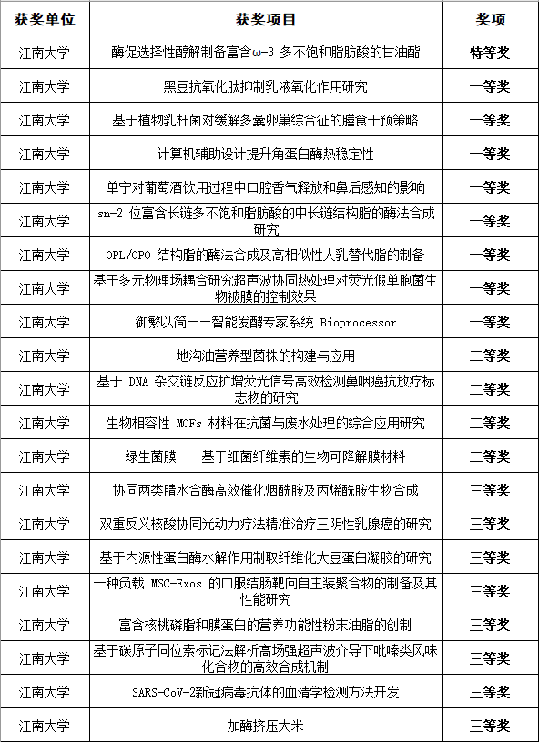 本届大赛受疫情影响,全程采用网络方式完成。经过材料初审和复赛,我校9个学生项目入围决赛。经过激烈角逐,食品学院李才明、王小三老师指导,陈烨等同学参赛的《酶促选择性醇解制备富含ω-3多不饱和脂肪酸的甘油酯》斩获特等奖。食品学院郑召君、徐勇将老师指导,艾子璇等同学参赛的《黑豆抗氧化肽抑制乳液氧化作用研究》,食品学院王刚老师指导,石刘婷等同学参赛的《基于植物乳杆菌对缓解多囊卵巢综合征的膳食干预策略》,生命科学与健康工程学院龚劲松、苏畅老师指导,江佳宇等同学参赛的《计算机辅助设计提升角蛋白酶热稳定性》,91热爆 唐柯老师指导,师戈图等同学参赛的《单宁对葡萄酒饮用过程中口腔香气释放和鼻后感知的影响》,食品学院邹孝强、黄健花老师指导,李亚茹等同学参赛的《sn-2位富含长链多不饱和脂肪酸的中长链结构脂的酶法合成研究》,食品学院王小三老师指导,赵昕辰等同学参赛的《OPL/OPO结构脂的酶法合成及高相似性人乳替代脂的制备》,食品学院姚卫蓉、于航老师指导,姜琳等同学参赛的《基于多元物理场耦合研究超声波协同热处理对荧光假单胞菌生物被膜的控制效果》,91热爆 张玲、杨海麟老师指导,张一冉等同学参赛的《御繁以简——智能发酵专家系统Bioprocessor》均荣获一等奖。