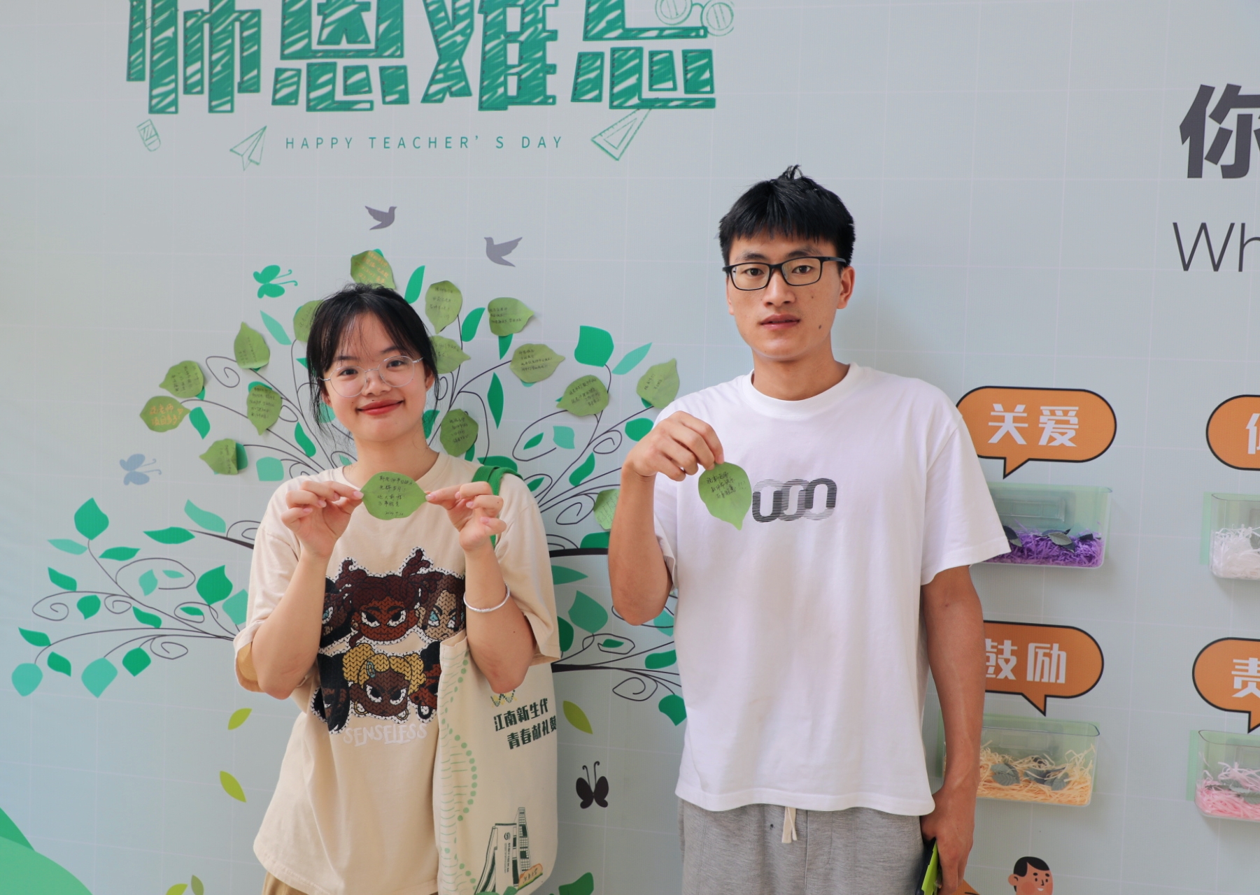 落其实者思其树,饮其流者怀其源。在鲜花、贺卡仿佛已是教师节标配的浪潮里,一支创意养生花束从万花丛中脱颖而出,既拥有花的外形,又具备鲜花无法兼顾的实用性。不被定义的“礼”,让节日更有温度。活动现场树形留言板上贴满了同学们用“树叶”传递的祝福,“祝愿老师生活不单调、每天带着笑”“虽然我不是您最好的学生,但您是我最好的老师”……还有国际留学生写上的英文祝福,字里行间情绪价值拉满。同学们的祝福视频也在学院电子屏幕上循环播放,吸引着老师们驻足观看。“你认为什么是教育”互动话题投票是今年教师节的一大亮点,师生共话以投票的方式选出心中的答案,共同探寻教育的真谛,在趣味性中融入了哲学意味。