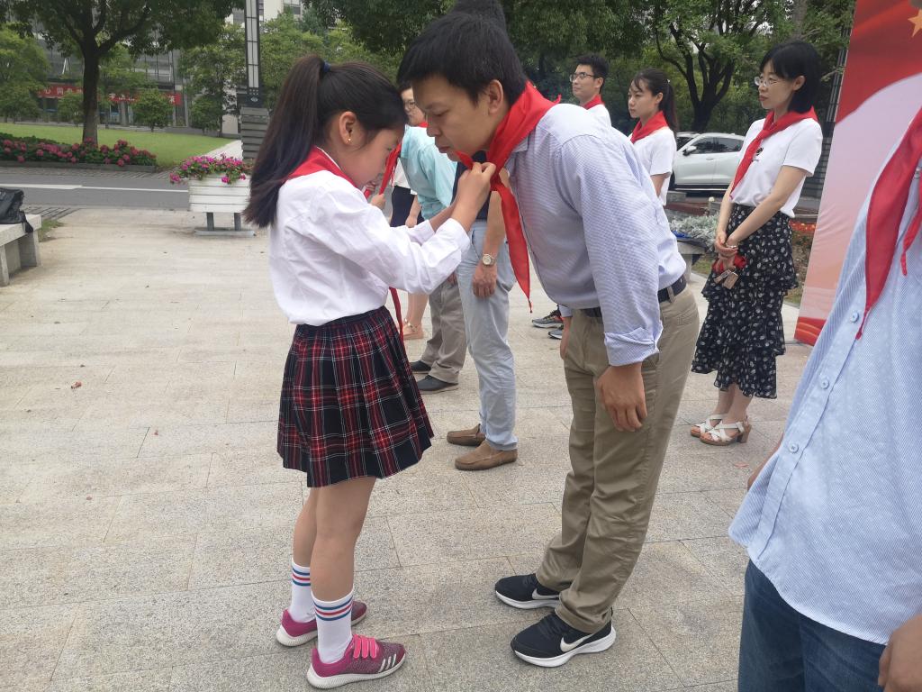 首先参加活动的小朋友给嘉宾和父母敬献红领巾,并担任升旗手、护旗手,与国旗班同学一同出旗、升旗,同唱国歌。通过亲身参与,坚定理想信念,增加爱国情怀。国旗班同学通过给小朋友的示范,也进一步体悟到了青年的责任与荣耀。