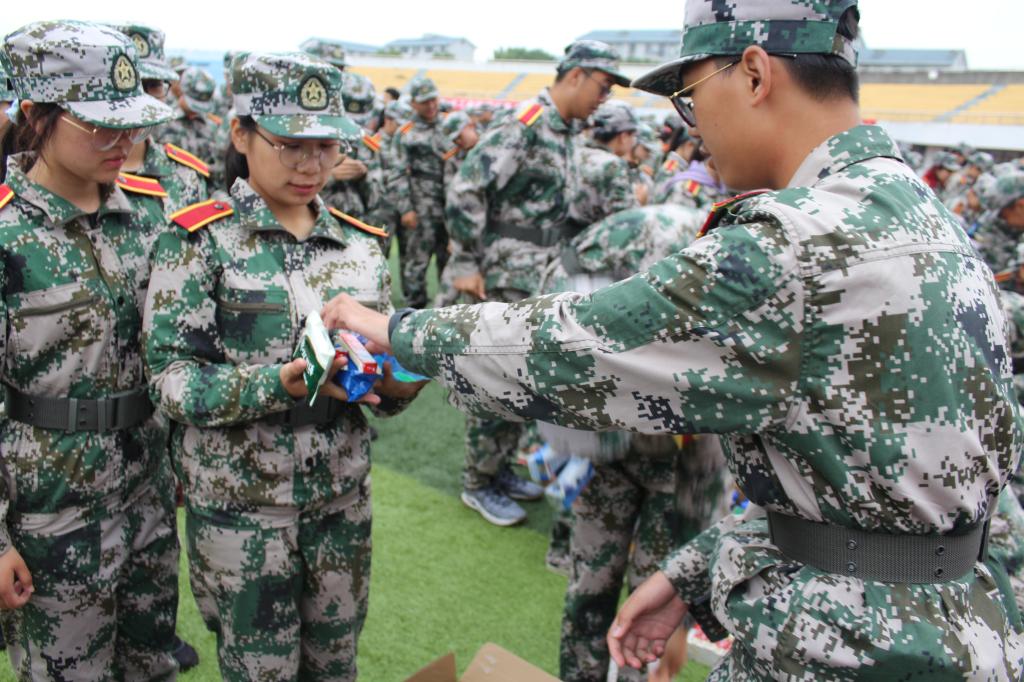休息时间开始,同学们按班级顺序排队领取慰问品,同时学院领导悉心询问同学们的训练情况,对同学们的身体状态表示了关心。在慰问同学们的同时,老师们也为军训期间艰苦付出的教官们准备了慰问品,感谢教官对同学们的照顾与关怀。