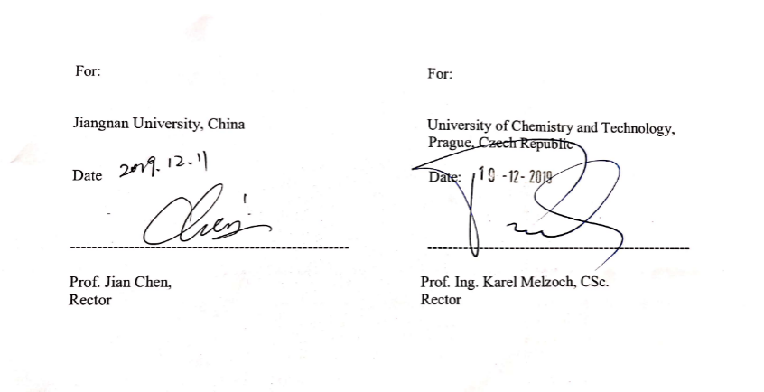 与捷克布拉格化工大学通过互访就双方共同感兴趣的合作点进行了多轮次的研讨。近期,两校正式签署校际合作协议,旨在建立两校之间的长期友好合作关系,推进并加快落实校际合作办学机构或项目的设立,并在生物工程类研究生的联合培养、博士双学位授予以及科学研究等方面进行深度合作。协议的签订与实施将进一步助推我校轻工技术与工程学科国际影响力的提升。