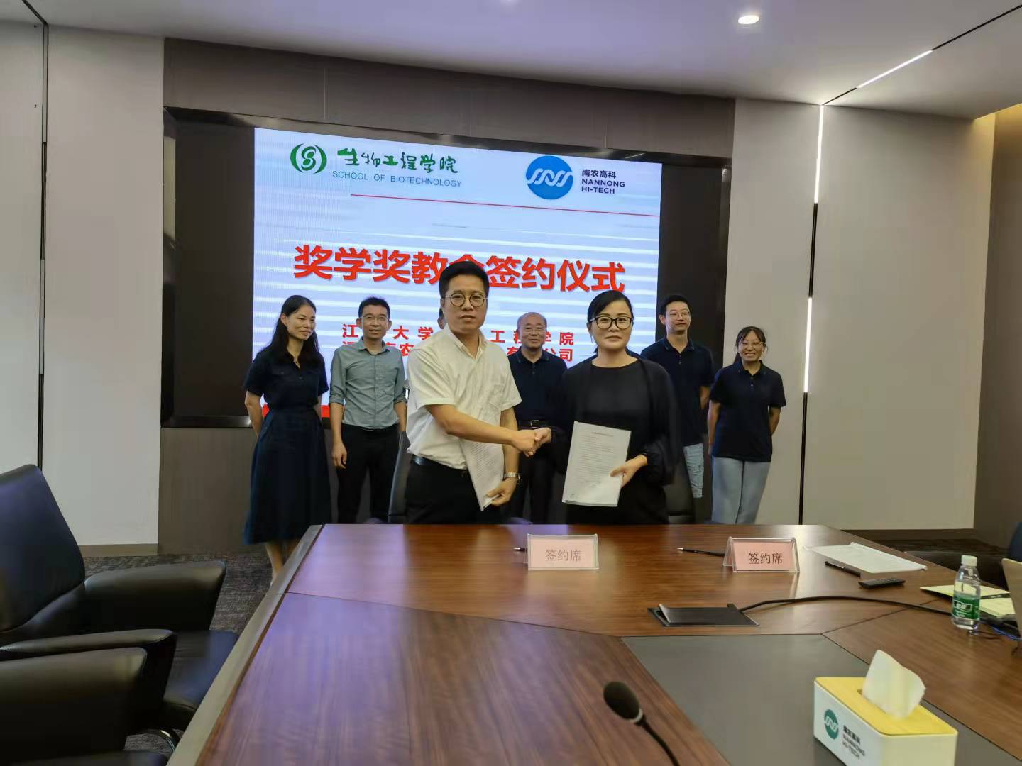 党委副书记周云龙和南农高科人事部门副总经理周琳签署了“南农高科奖学奖教金”协议。会后,许正宏、黄敏一行还参观了南农高科的生产车间、实验室,并就企业产品研发等相关问题进行了交流和探讨。