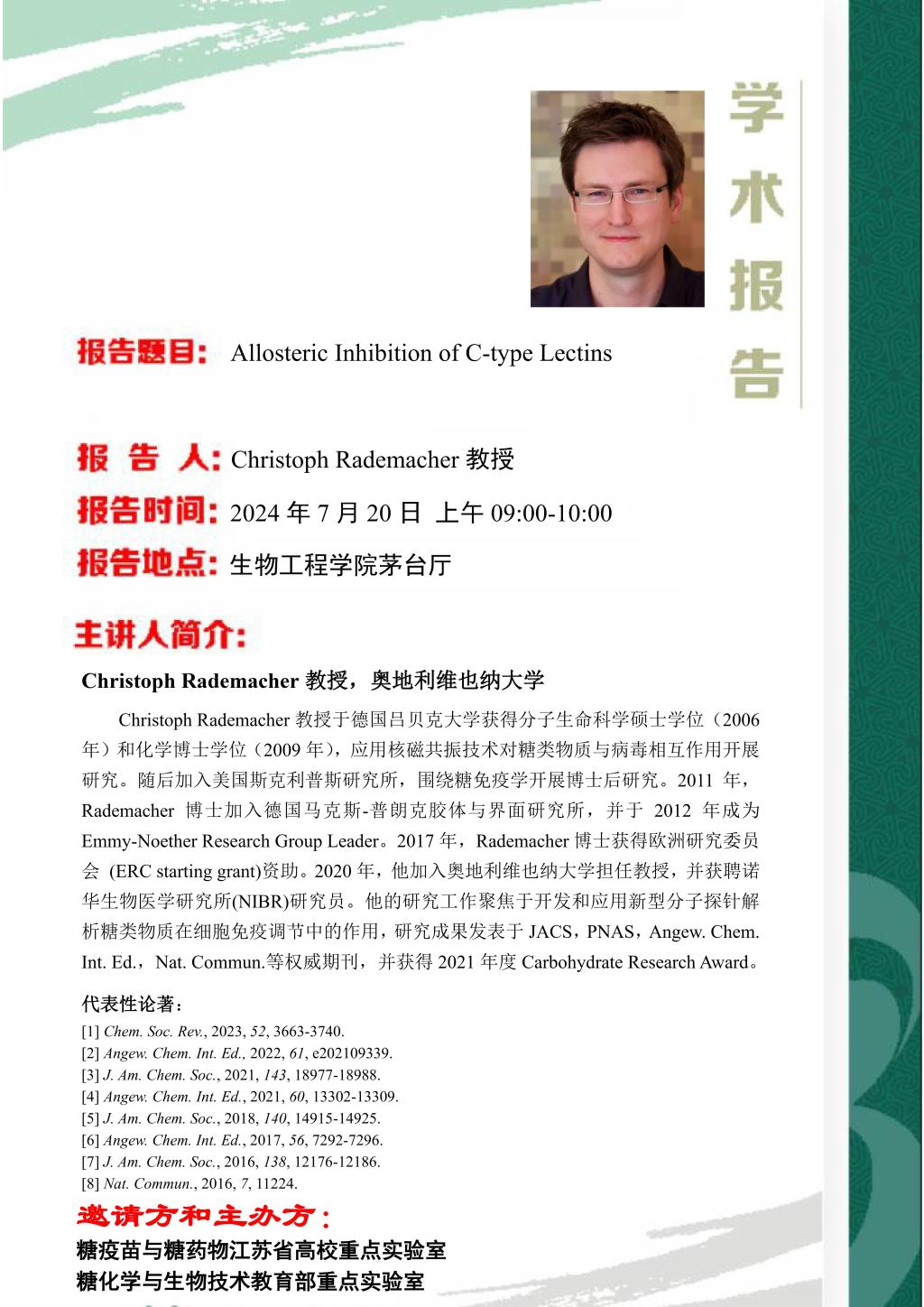 下一篇:7月19日学术报告:Preventing and Fighting Diseases: Carbohydrate-based Vaccines and Anti-Glycan Antibodies