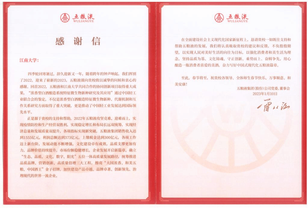 共同合作的协同创新项目取得系列重要成果,“浓香型白酒酿造系统特征微生物新种研究及其应用”通过中国轻工业联合会的鉴定,在浓香型白酒酿造特征微生物新种、代谢机制和互作关系研究方面取得重要突破。后期,校企双方将进一步加强产学研合作,不断提升创新人才培养质量,推进科技创新和成果转化应用,协同奋进构建校企发展共同体。