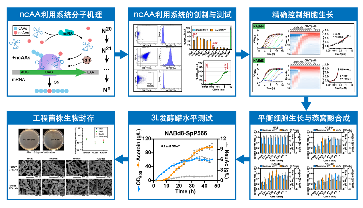在该研究中,为了扩展细胞生长调控方法适用范围局限并且避免胞内代谢物干扰的问题,研究人员引入了基于密码子扩展的正交翻译系统。该系统可以实现在代谢流调控和细胞生长关键酶中插入非天然氨基酸(ncAA),并通过“精确滴定”非天然氨基酸来“精准控制”代谢流量和细胞生长。研究人员分别在基因组重编码的大肠杆菌与基因组未重编码的枯草芽孢杆菌中进行了测试。通过精确控制ncAA(pAcF)添加,产N-乙酰氨基葡萄糖(乙酰氨糖)的大肠杆菌细胞生长与乙酰氨糖合成同时改善,菌株OD600提高2.1倍,乙酰氨糖产量提高4.5倍。在枯草芽孢杆菌中,研究人员结合理性设计与非理性筛选,首先成功构建了ncAA高效利用系统,实现约80倍的基因表达水平激活。然后,通过精确控制ncAA(OMeY)添加,实现了产N-乙酰神经氨酸(燕窝酸)重组枯草芽孢杆菌的最大比生长速率的精准控制,燕窝酸产量提高2.2倍,副产物乙偶姻产量降低87.2%。最后,研究人员扩展了细胞生长精准调控系统的应用规模与应用功能,分别实现了3 L发酵罐中燕窝酸产量提升3倍(至9.7 g/L)与重组枯草芽孢杆菌的“生物封存” (避免重组菌逃逸至自然环境中繁殖),为生长与代谢精准可控高版本底盘细胞创建提供了新策略。