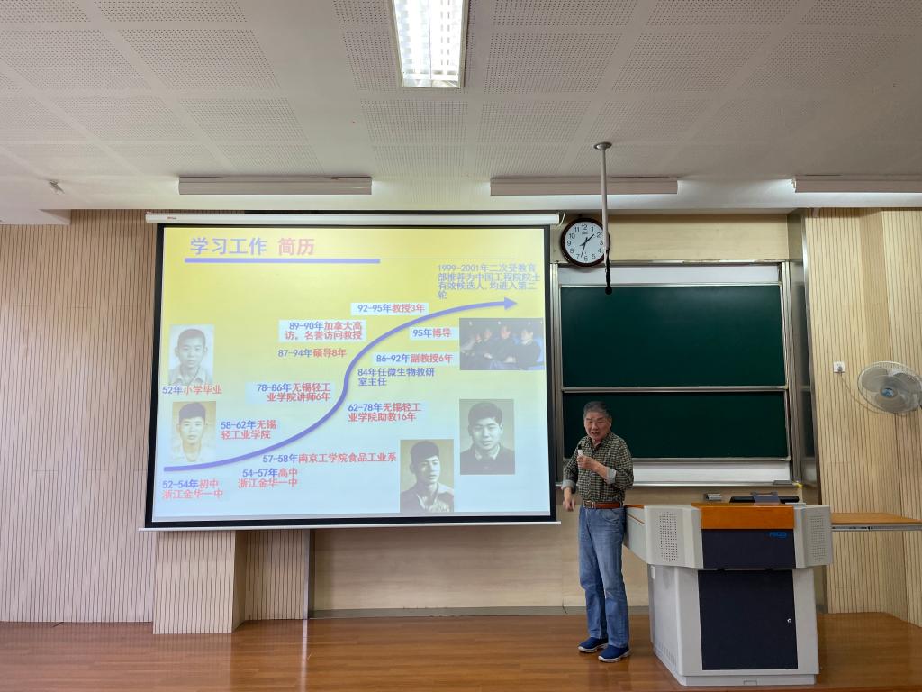 讲座伊始,诸葛老师介绍了自己成长学习经历。少年时特殊的家境和独特的人生体验塑造了不畏艰苦、敢冒风险、勇于独立的精神品质。他以亲身经历讲述人生两次重要拐点:考入南京工学院食品工业系就读发酵专业和拒绝加拿大移民邀请甘愿奉献祖国。诸葛老师以此勉励学生“学一行、干一行、爱一行才有出息”并且要有为国家发展奉献的信念决心。