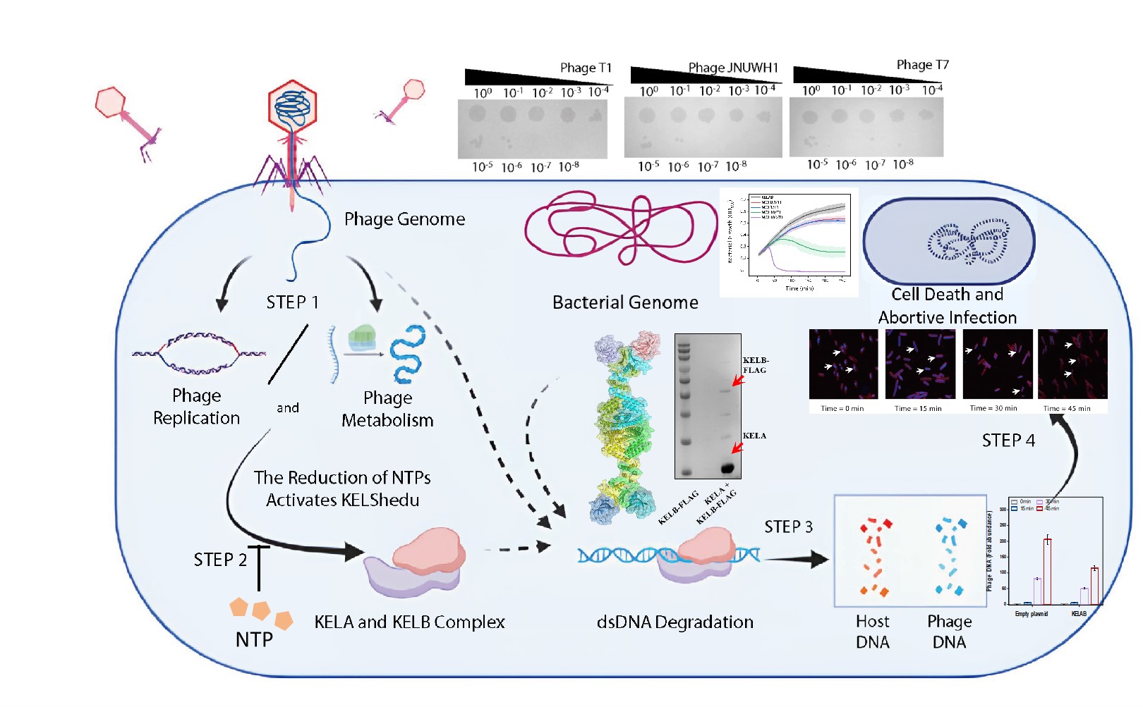 噬菌体是感染细菌的病毒,严重威胁有机酸、氨基酸等依赖细菌发酵的高价值工业品的工业生产。在自然环境中,噬菌体与其宿主细菌与之持续进行进化军备竞赛,推动了复杂防御和反防御机制的演化。该研究鉴定并表征了一个位于大肠杆菌中的新型双组分噬菌体防御系统——KELShedu。该系统通过“流产感染”(Abortive Infection, Abi)机制赋予宿主细菌广谱的噬菌体抗性,其由KELA(一个双链DNA结合蛋白)和KELB(一个含有DUF4263结构域的金属离子依赖性核酸酶)组成。KELA能够非特异性地结合dsDNA,而KELB则发挥依赖锰离子的核酸酶活性,能够切割多种形式的DNA,KELA和KELB通过形成复合物共同发挥抗噬菌体作用。进一步分析发现,该系统的核心激活机制依赖于细胞内NTPs(核苷三磷酸)的水平:生理浓度的NTP会抑制KELShedu系统的DNA切割活性,而噬菌体入侵导致的NTP耗竭则会激活该系统。一旦被激活,KELShedu会非特异性地降解包括宿主基因组和噬菌体DNA在内的所有细胞DNA,最终诱导细胞死亡,实现“流产感染”。阐明KELShedu系统抵抗噬菌体侵染的分子机制,不仅有助于深化对细菌防御策略的认知,也将为发掘和解析新型抗噬菌体元件提供关键理论支撑。在此基础上,进一步指导构建具有高抗性与广谱性的抗噬菌体底盘细胞,从而为以大肠杆菌为底盘细胞的高效合成氨基酸、有机酸等高价值产品的生物制造产业奠定坚实基础。