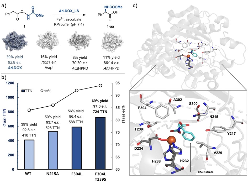 基于金属氮宾反应机制,本研究对1,3-氮宾迁移类型的反应进行了考察。研究人员对实验室的金属酶库进行筛选,获得了对模型反应的初始活性,在确定反应的产物结构和反应的对映体选择性后,发现Arabidopsis Thaliana 来源的Leucoanthocyanidin Dioxygenase(AtLDOX)野生型酶,对该模型反应表现出较好的催化性能(39%产率、92/8对映体选择性)。于是,研究人员选择该酶作为起点进行后续定向进化。